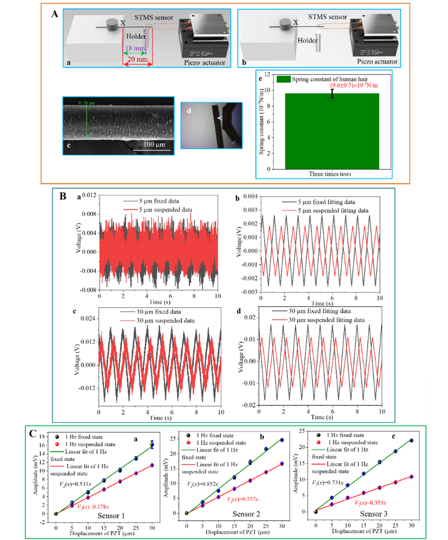 图2:利用STMS传感器测量人类头发丝弹性系数。