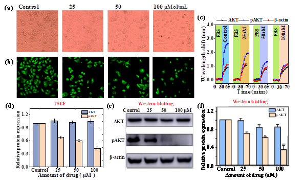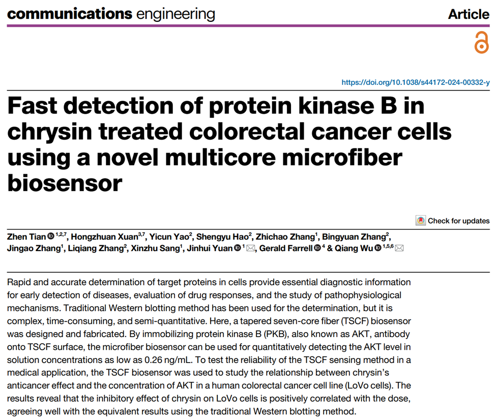 创新成果2:联合采用用锥形七芯光纤(TSCF)生化传感器实现对AKT蛋白的高灵敏度检测,相关成果以“Fast detection of protein kinase B in chrysin treated colorectal cancer cells using a novel multicore microfiber biosensor”为题,发表于Nature子刊《Communications Engineering》(2024年12月26日)